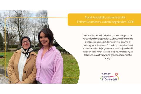 Als extern begeleider ondersteunt Esther Beurskens (Externe Dienstverlening) leerkrachten bij hulpvragen rondom gedrag. Sinds kort gebeurt dat soms samen met Najat Abdeljalil (Samen Leren in Diversiteit).